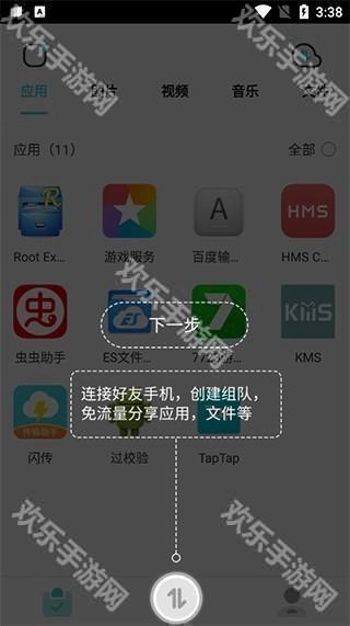 2、与好友的手机建立连接,创建组队后,即可免流量分享应用、文件等内容;