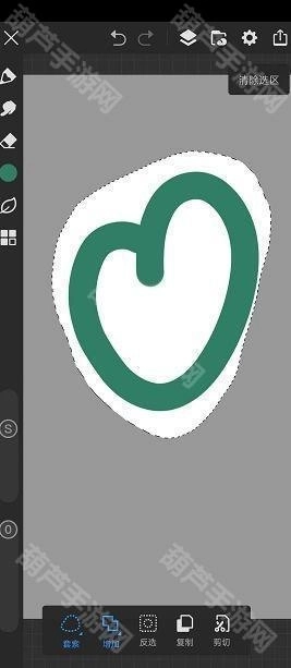 3、然后回到画布上,界面现在都是灰色的,灰色代表未选取部分,选区的部分会变成白色,画世界pro里面的选区方式和柳叶笔工具差不多,跟ps不太一样,大家可以自己试试,总之选取之后就是这样: