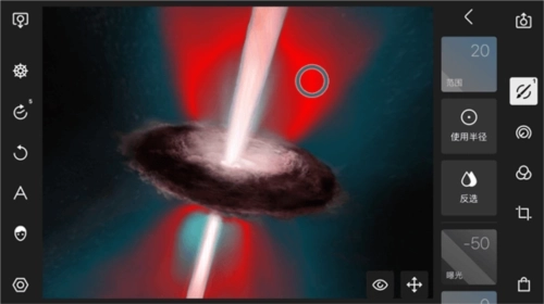 使用笔刷功能时,我们能够手动画出调整区域,所有调整操作都仅对这些区域生效。当选择笔刷工具后,用手指绘制区域的过程中,会出现红色区域,这些红色区域即为被选中的区域。