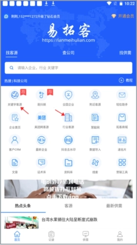 1、软件有很多种找资源的方式,我这儿主要讲其中两个,一个是关键字客源,一个是行业客源。