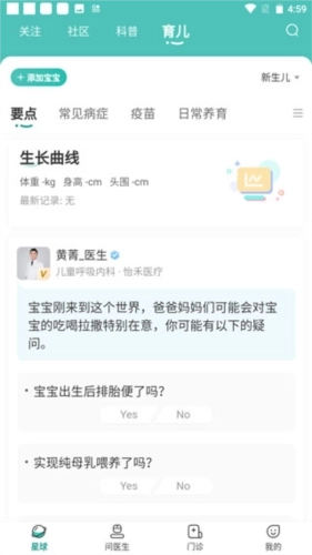 2、来到了主页面,这里是刚出生的宝宝专区,里面是医生建议。
