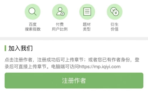 如果说你们想要在爱奇艺小说软件里面进行投稿的话,那么你们是必然要成为作者的,只有成为了作者之后你们才可以进行投稿的,所以你们可以首先打开软件,然后你们就点击最下面的一行的【我的】,这个时候你们就可以看到中间的位置有一个【成为作者】,点击进入之后你们就可以直接看到的是【注册作者】。
