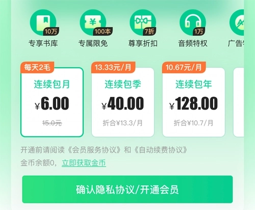 如果说想要去除广告或者更多的一些的功能的话,你们成为爱奇艺小说软件的会员是最好的,但是会员是要钱买的,会员的价格的话6元每个月,40元每个季度,128元每年,这三个都是自动续费的。然后18元每个月,50元每个季度,158元每年,这是不自动续费的。你们可以根据自己的实际情况去选择。
