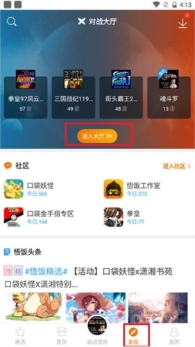 2、在最下方选择进入发现专区,然后看到上面的对战大厅,直接点击“进入大厅”;