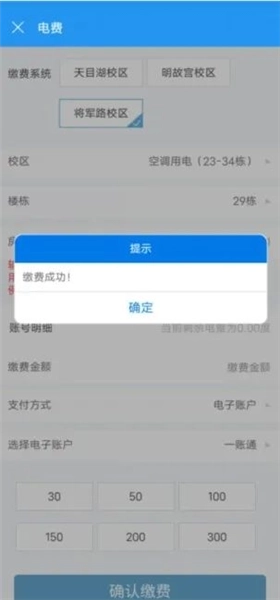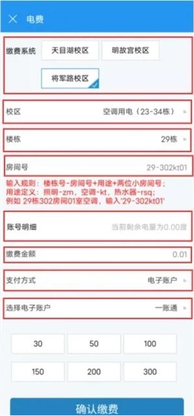 4、填写对应信息:校区、楼栋、房间号、金额,如下图: