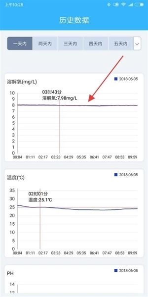 3、历史数据页面可按一天内等时间维度查看,展示了溶解氧、温度等参数变化曲线,清晰呈现各时间点数据,助力分析水质历史变化。