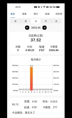 软件实时的统计用户的运动数据,让用户更好的了解每月的运动数据。