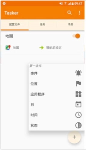 2、例如以我前面所举的例子为例,我的条件就是:当Google地图启动时要触发某些行为。这时候我就点右下角的「+」,选择应用程式,选择Google地图。