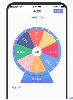 小决定转盘选择器是一个非常方便又实用的手机转盘小工具。用户可以直接通过本软件进行转盘选择,小决定转盘选择器软件内有多种选择小工具,帮助用户决定想法。用户可以自定义常用决定,也可以直接使用系统预设模板。软件内精美的动画效果和真实的模拟转盘体验感让用户流连忘返。快来试试吧!