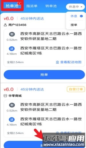 2、在抢单池界面查看所有可接的订单,点击“抢单”按钮就能迅速领取配送任务。