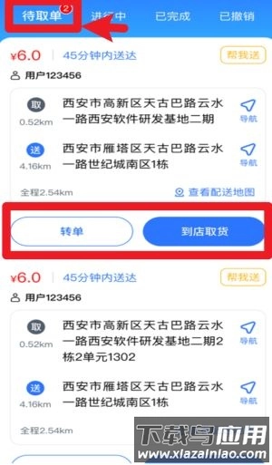 3、在待取单页面可查看已承接的订单信息,支持进行转单操作,或点击“到店取货”按钮进入取件流程。