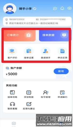 4、个人中心整合了订单统计、客户评价等功能,便于骑手管理数据和开展日常工作。
