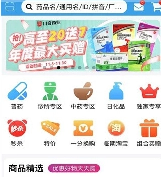 1、平台内的优质药品均已整齐分类,用户进入平台后可精准选择所需药品。