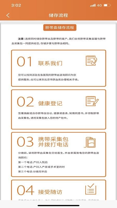 3、进入“储存流程”页面,了解储存脐带血的详细步骤。