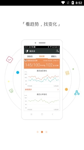 爱家康血压计是北京爱和健康科技有限公司推出的一款血压计测量软件,手机和App连接简单,一点就测,同时为您提供专业的数据解读,让爸妈清楚明白。用户只要将家中的血压计和手机相连接,就可以轻松测量血压情况,如果你经常外出,不妨在父母手机上安装“爱家康”,随时随地掌握亲人的血压变化,时刻关爱父母的身体健康。