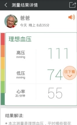 【亲情互动】:实时查看亲友测量的血压数值,方便的给与关怀和鼓励;