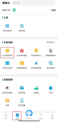 第一步,进入后点击下方菜单栏的“服务”—“失业保险”申领;
