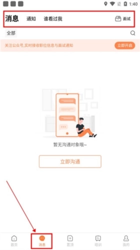 7、点击消息,这里能够看到你跟hr的聊天界面,还有通知、谁看过你和面试;