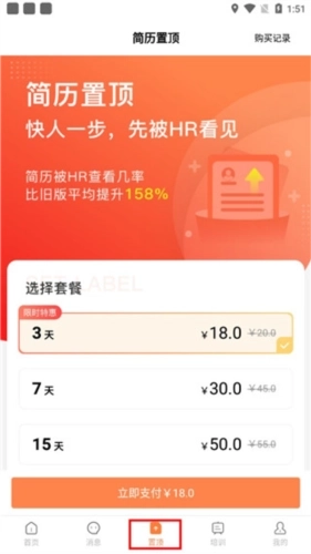 8、选择置顶板块,购买套餐置顶你的简历,让你这块金子给更多人看到;