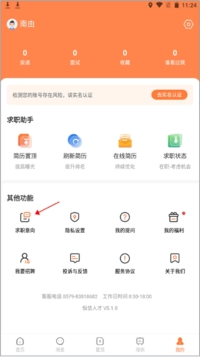 1、注册好账号并登录后,切换到“我的”界面,点击其他功能的“求职意向”。