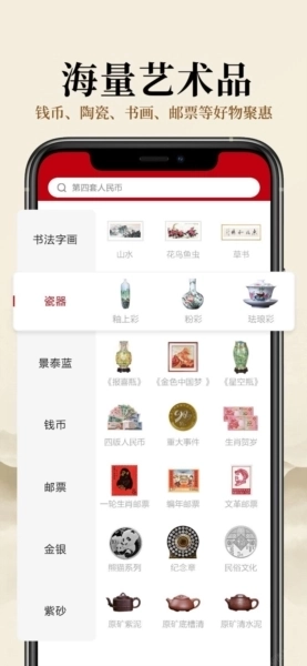 线上10万余款艺术品收藏品,涵盖书法、绘画、瓷器、景泰蓝、紫砂以及各类非物质文化遗产。由线下2000平米艺术馆为依托,从选品到上线,200位专家及工作人员层层筛选。只为给用户推荐更具收藏潜力的艺术品收藏品。