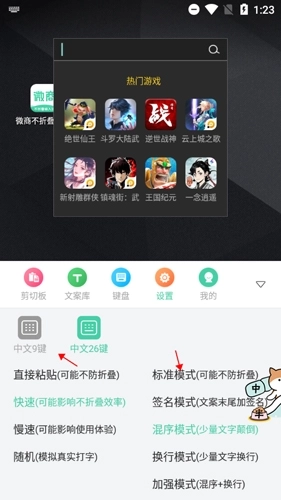 微商不折叠输入法是一款由重庆杨桃科技有限公司所研发的微商输入法软件。这款软件将为用户带来非常实用的微商发动态功能,然你的朋友圈更加的亮眼,同时还可以防止折叠,让你的信息更加的有效。不折键盘并使用我们键盘上的粘贴按钮,复制并粘贴长文本,即可实现自动逐字输入发到朋友圈,避免折叠成一行,还可以很方便地调整粘贴速度!