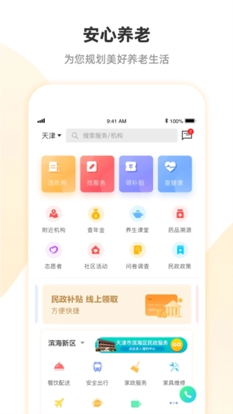 安心养老是一款专门为老人设计的软件。你们有没有想象过老了以后怎么办,如何在老去之后还能和这个时代对接。家里的老人如何才能安排妥当。安心养老向养老客户提供专业的“一站式”养老综合服务。从老人的衣、食、住、行、医、情、财7个纬度需求,实现全方位服务覆盖。老人用的方便,子女用的方向,家庭一篇欣欣向荣。它构建了一个以居家为基础、社区为支撑、机构为补充的养老生态体系,保证老人们享有舒适、安全的晚年生活。不管是计划养老还是已步入养老阶段的人士,都能在此找到贴心的服务与支持,提升生活质量。安心养老,开启轻松愉悦的养老新体验!
