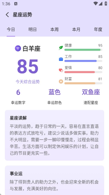6、此外,【星座预览】功能还能为用户提供涵盖【今日、明日、本周、本月、年度】等不同时间维度的星座云故事解析。