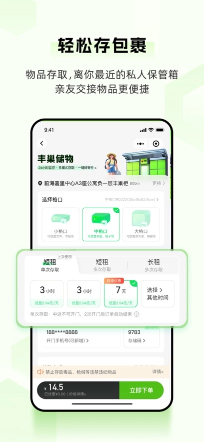 - 储物便捷:物品可暂存,存取灵活,1小时即可起存,提供临时存放与长期存放两种选择。
