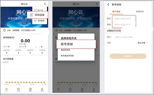 在网心云平台的界面右上角找到加号图标,点击后选择添加设备选项,接着在激活码关联环节,输入该设备此前绑定的玩客云账号,即可完成设备关联操作。