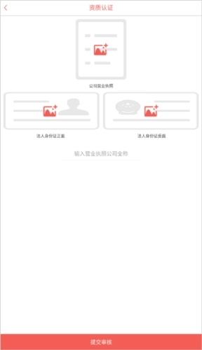 2、来到认证界面按要求添加公司营业执照、法人身份证正面、法人身份证反面,输入营业执照公司全称点击提交审核即可。