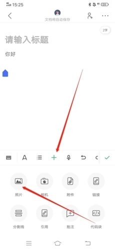 2、然后将编辑光标放在想要添加图片的位置,点击下方的“+”,然后在点击“图片”;