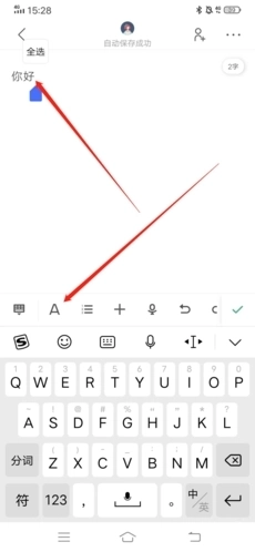 1、进入想要编辑的文档后,首先让我们选择想要改变颜色的文字,然后在点击下方的“A”按钮;