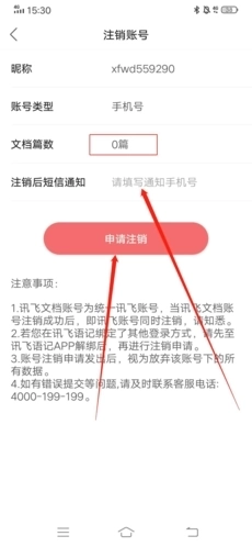 3、想要注销账号的话,我们的文档篇数就得是0,所以要将全部文档都删除掉,然后输入手机号,再点击“申请注销”;