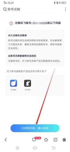 5、在链接中,查看注销的相关风险,点击下方的“已清楚风险,确认继续”;