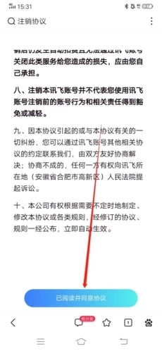6、然后在查看注销协议,下拉到最底部,点击“已阅读并同意协议”;