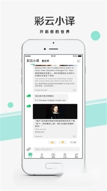 当你输入“看看”,小译就会为你推荐来自知名网站的精选科普内容,并且会以双语对照的形式呈现出来,让你足不出户就能轻松学习知识。