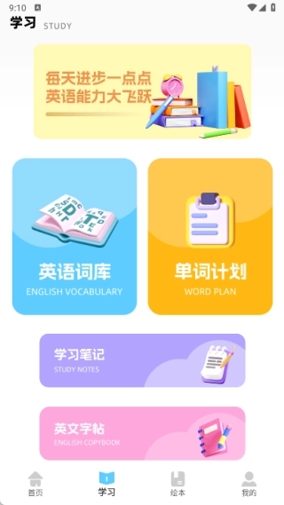 3、学习页面包含英语词库、单词计划、学习笔记以及英文字贴等功能模块;