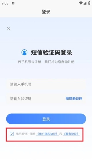 3、登录时需勾选底部“我已阅读并同意用户协议”选项,才能继续后续操作。