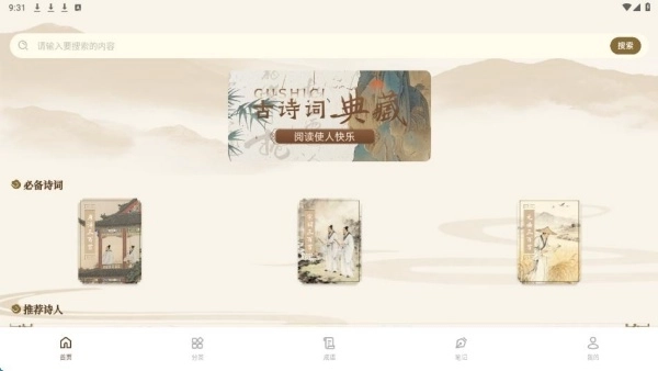 1、完成安装后进入首页,这里陈列着必备的诗词内容,同时提供搜索功能支持。