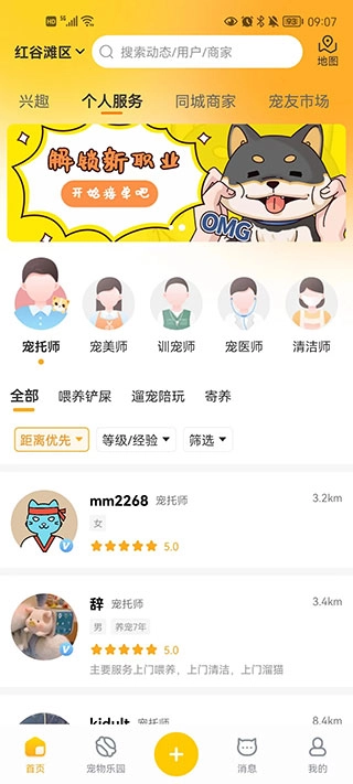 3、包含宠物领养、借配、上门喂养、清洁、寄养、知识科普等诸多实用功能。