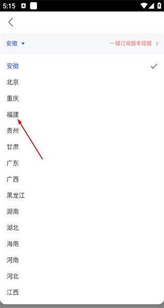3、进入地区选择页面后,浏览省份列表,找到并选择“福建”选项,即可切换至该地区对应的报考信息页面。