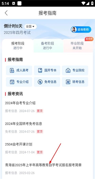 1、启动软件后,进入报考指南页面,查看报考相关资讯,点击青海省自考报名简章进入详情页面。