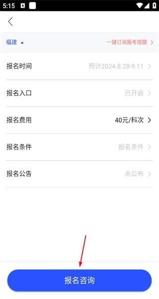 4、进入福建报考信息页面,查看报名相关内容,点击报名咨询按钮以获取报考相关帮助。