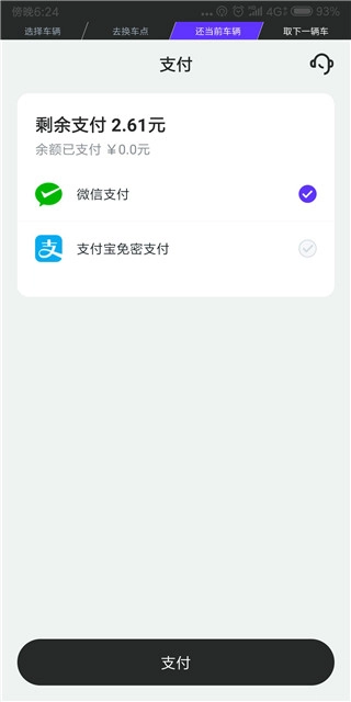 到达换车地点后,点击“开始换车”,归还并结算当前车辆
