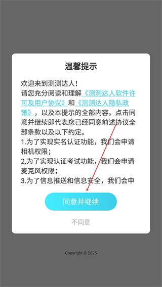 1、进入【测测达人】应用后,确认协议内容后,点击【同意并继续】按钮,即可完成协议确认,进入应用使用相关功能。