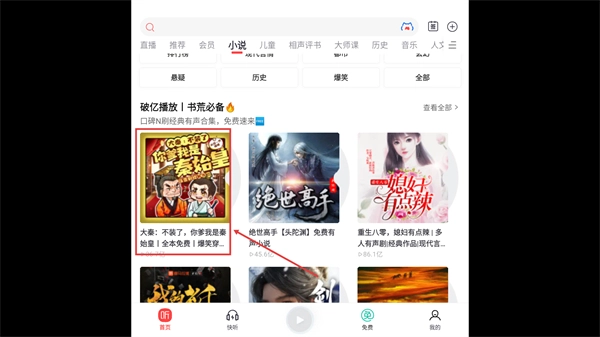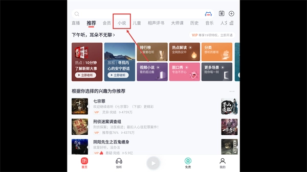 1、在首页点击【小说】分类标签,进入有声小说专区。