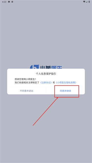 1、在【小荷医生】的个人信息保护指引页面,点击【同意并继续】按钮,确认相关协议内容后,即可进入应用的后续流程。