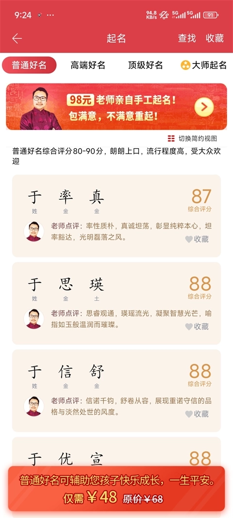2、接着就能看到包含【普通好名、高端好名、顶级好名、大师起名】在内的几大板块