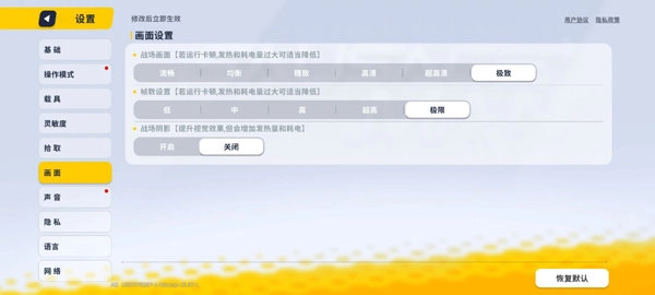 3、点击进入设置,在设置选项中找到画面相关设置,将战场画面、帧数等参数设置为极致状态。